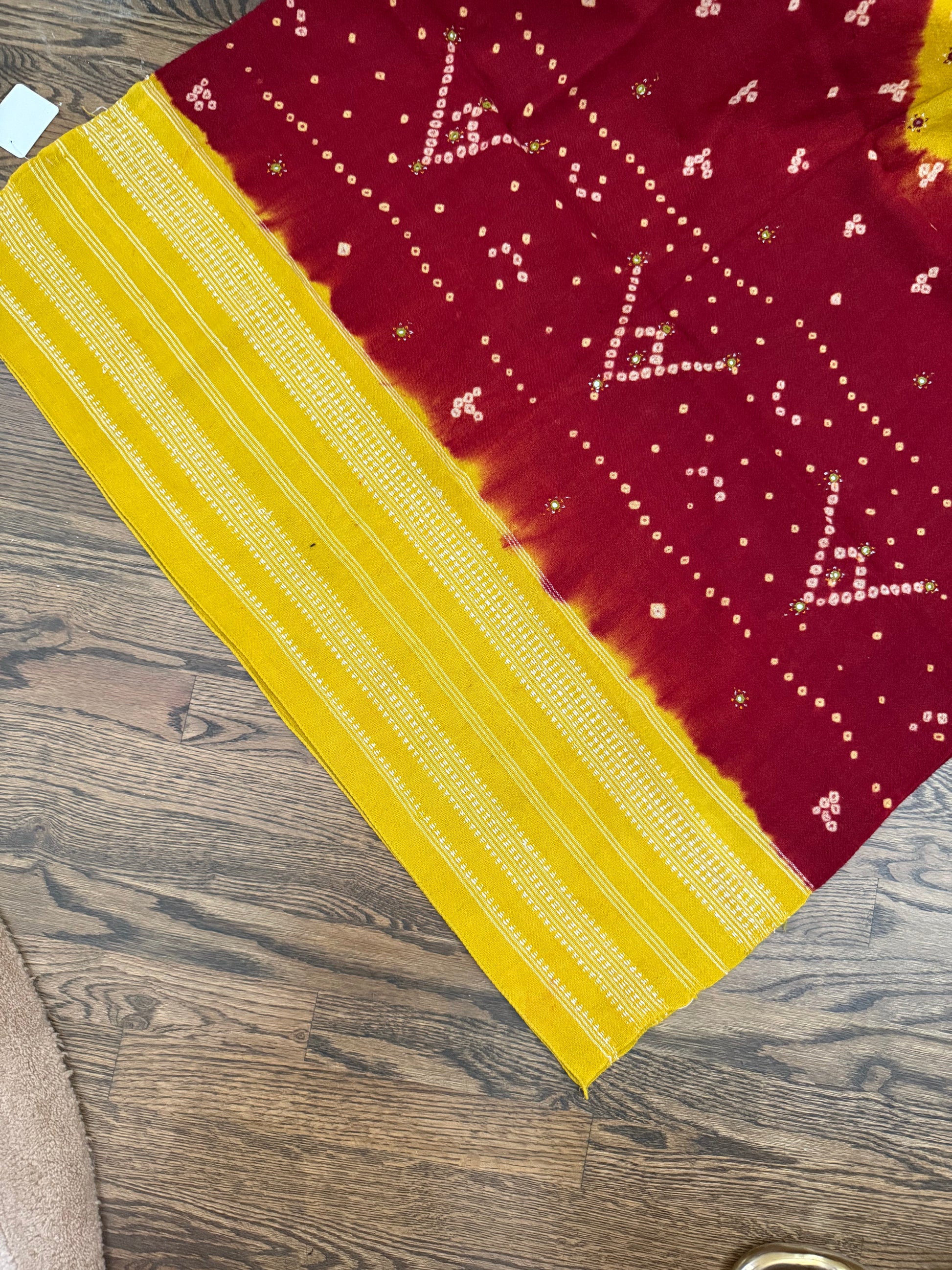 Hand Woven Bandhej Marino Sheep Wool Shawl - Lime Yellow/ Maroon