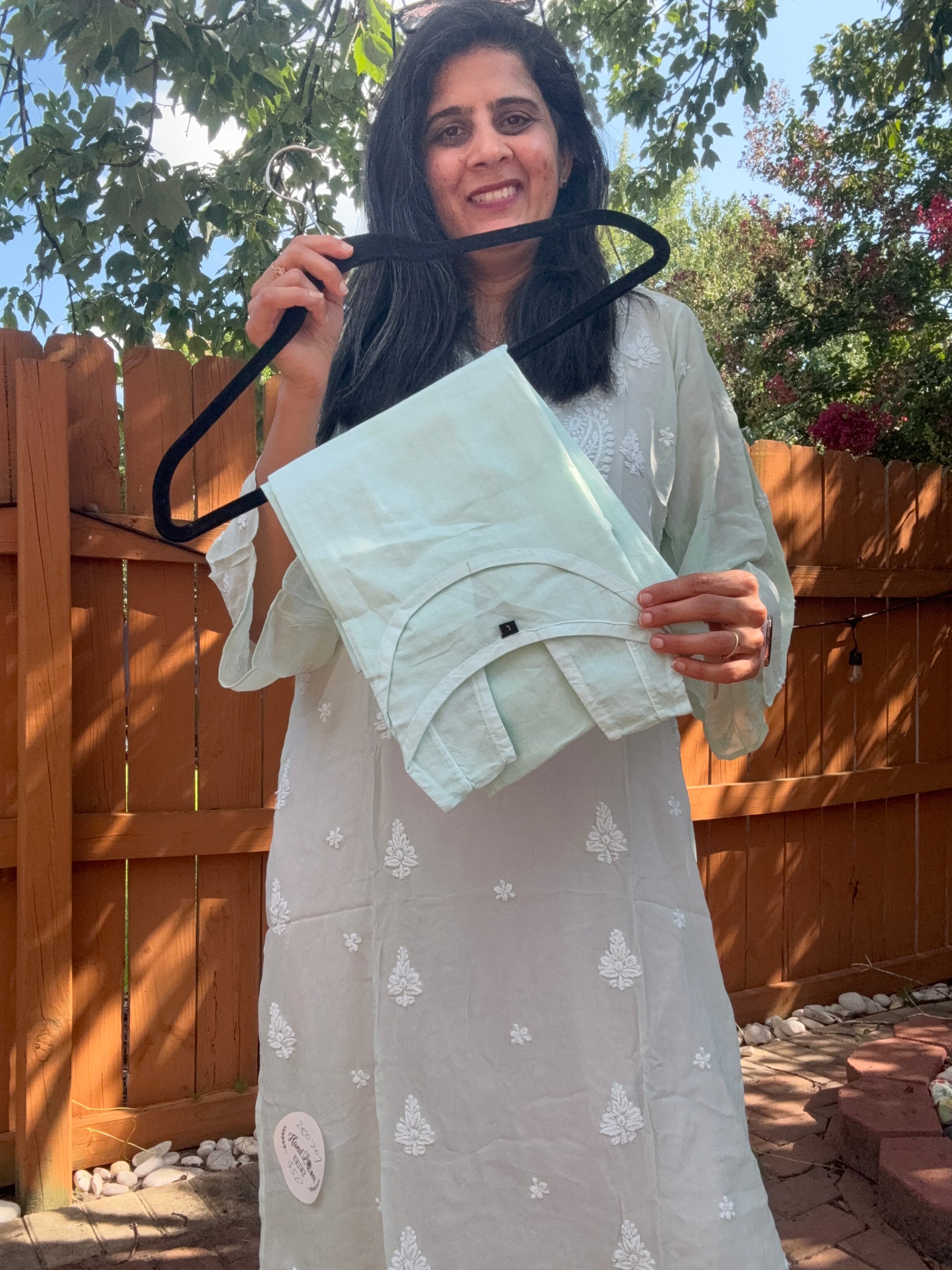 This time, we’ve brought you a kurta in Georgette. The fabric is super light and breathable. And then there’s the embroidery… every little flower, every tiny motif is done by hand. No machine can give you this softness, this charm.