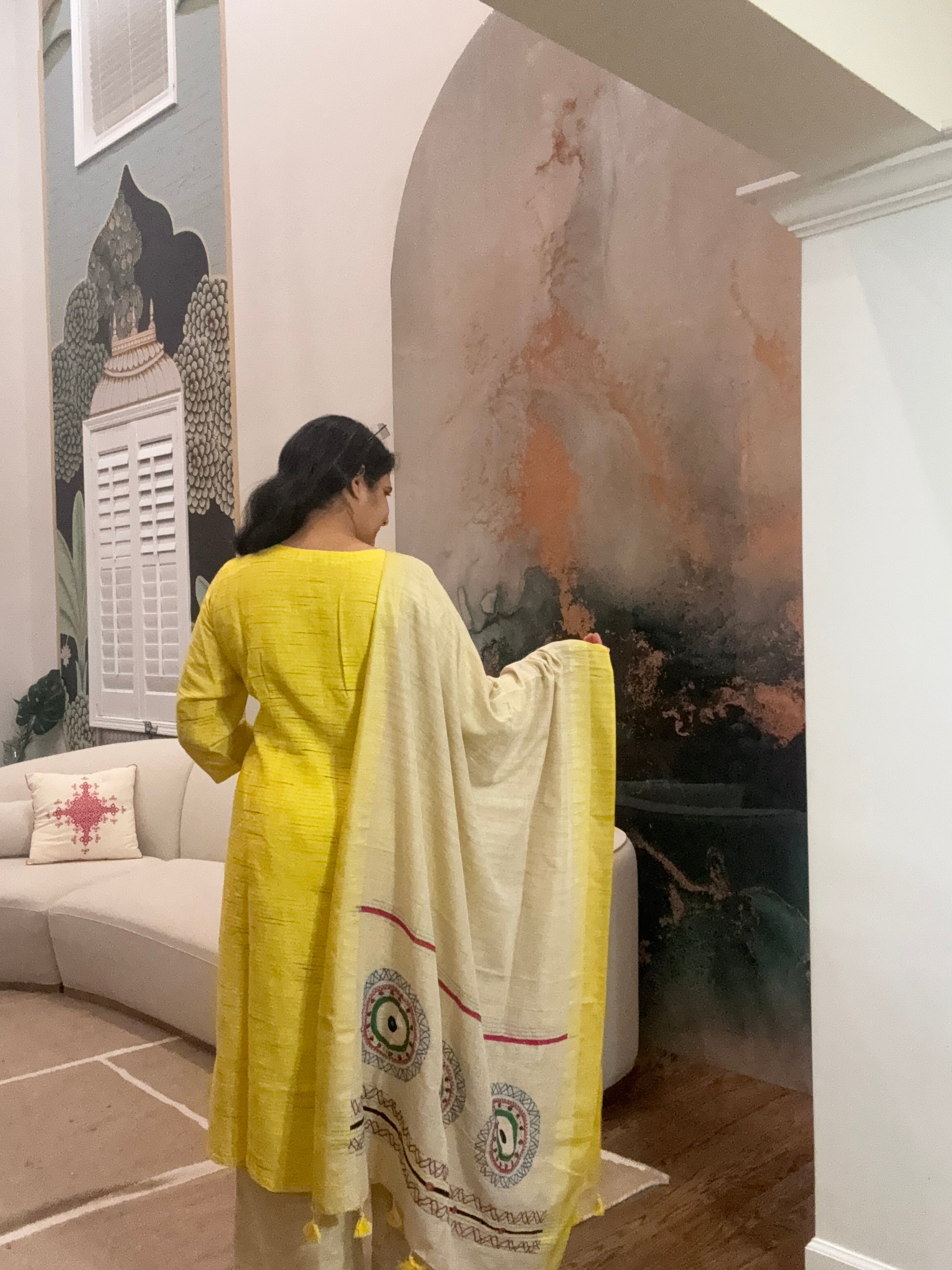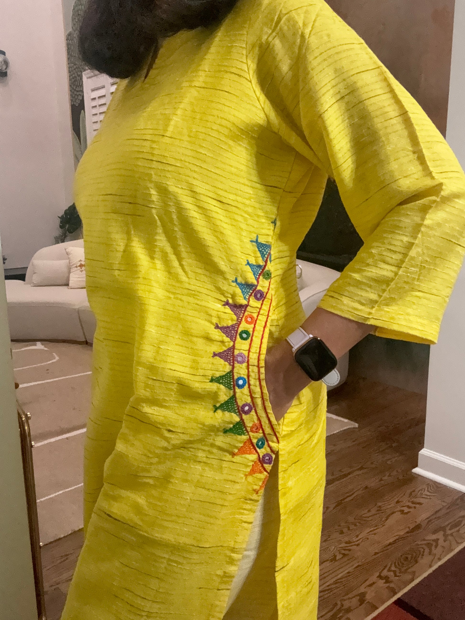 The kurta has beautiful lambani embroidery, and I love that it also has a pocket—it’s those little things that make such a difference. The pants are super easy and comfortable, with subtle edging details that add a nice finish… and yes, they have a pocket too (because we all look for that!).